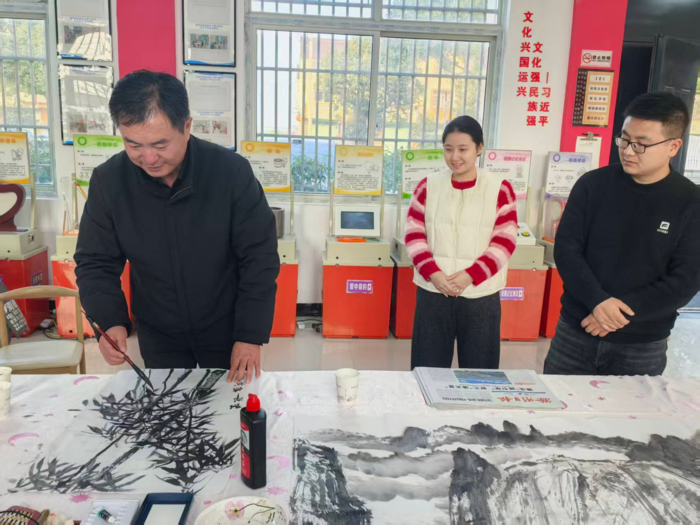 在镇文化站,侯鸿钧先生现场挥毫泼墨,创作了《魅力无限西卅店》等书法作品,其书法作品大气磅礴、力透纸背,充分展现了书法艺术的独特魅力。吴传平、朱菲、滕斌等画家也纷纷展示了自己的艺术才华,以各自独特的风格创作了山水、花鸟画,作品精美绝伦,为现场观众带来了艺术的享受。