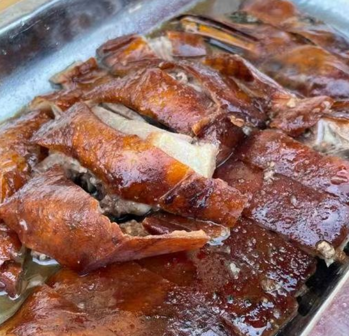 只见师傅手起刀落,“咔嚓”一声脆响,薄如纸的鹅皮应声裂开,滚烫的肉汁顺着刀刃缓缓滴落,光是看着就让人垂涎欲滴,大盘烧鹅上来,夹起一块趁热送入口中,第一口先是鹅皮的脆嫩暴击,牙齿轻咬便碎裂开来,油脂的鲜香在舌尖瞬间迸发,却丝毫不显油腻。紧接着是鲜嫩的鹅肉,肉质扎实又多汁,咸香中带着一丝自然的甜,每一丝肌理都浸满了秘制卤汁的风味,这正是洪记坚持现烤现卖匠心所在。配上店里自制的调料,酸甜口感中和了油脂,让风味更有层次,满口香、脆、鲜、爽,且分量实在,价格亲民,难怪这家店二十年前就圈粉无数。