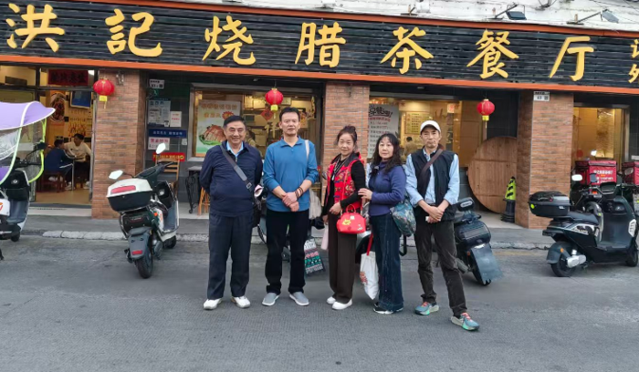 这次港珠澳之旅,曾经同游新疆的5位“驴友”,有幸再次结缘,12月16日从合肥出发经广州到达深圳。途中,见多识广的“驴友”姚平先生建议说:“深圳烧鹅乃是当地一绝,何不结伴品赏?”。到深圳,我们便直奔沙井一家火了三十多年的洪记烧腊茶餐厅。
