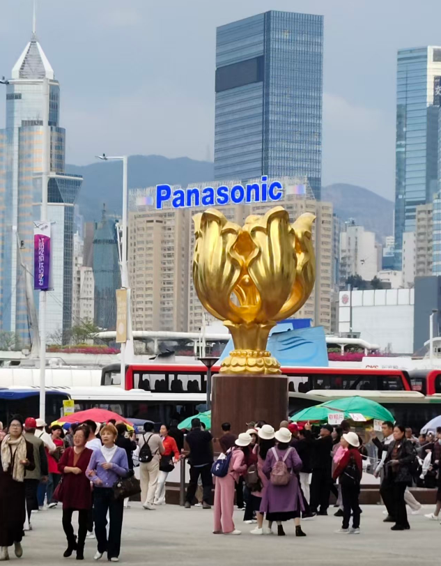 结束浅水湾的游玩,驱车直奔香港会展中心,这座依海而建的建筑线条流畅,银灰色外墙在阳光下熠熠生辉,像一艘蓄势待发的巨轮。与之相连的金紫荆广场上,紫金花雕塑金光闪耀,紫荆花是香港区花,五片花瓣代表香港多元文化的融合,体现“一国两制”下香港与祖国的紧密联系,传递香港“永远繁荣昌盛”的愿景。海风拂过,广场旁的国旗与区旗迎风飘扬,让人心中满是自豪。站在这里眺望海面,碧波荡漾,船只往来穿梭,尽显香港的繁华活力。