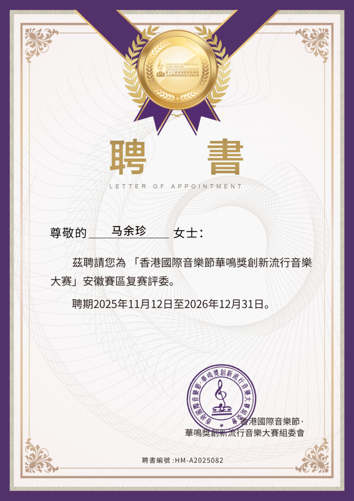 此次聘期自2025年11月12日起至2026年12月31日,马余珍老师将在这段时间内,作为评委参与香港国际音乐节华鸣创新流行音乐大赛安徽赛区的各项工作。