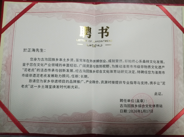 於正海,安徽韶亮文化科技有限公司董事长、古沟回族乡本土乡贤,虽常年在外拼搏创业,成就斐然,但其始终心系桑梓文化发展。鉴于於正海在文化产业领域的丰富经验、广阔资源与独到视野,为推动淮南市市级非物质文化遗产“泥老虎”的活态传承与创新发展,经古沟回族乡综合文化体育站研究决定,特聘任於正海先生为淮南市市级非遗泥老虎发展助力顾问,任期长期。