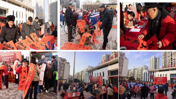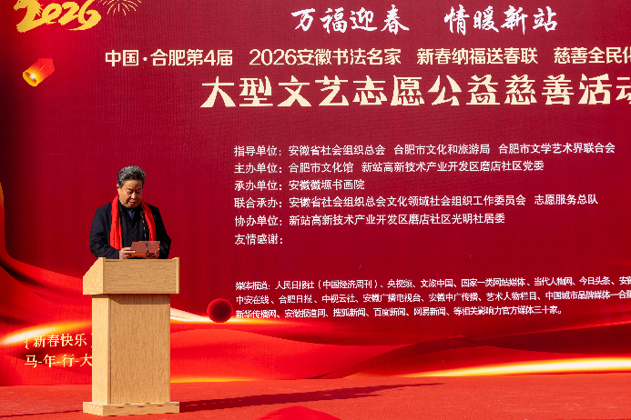为积极响应安徽省“强基工程”和2026新春特别行动“万福迎春·情暖江淮”公益活动的统一部署,2月4日下午,由安徽省社会组织总会、合肥市文化和旅游局、合肥市文联指导,合肥市文化馆、新站高新区磨店社区党委主办,安徽徽塬书画院承办,省社会组织总会文化领域社会组织工作委员会、志愿服务总队联合承办,磨店社区光明社居委协办的“万福迎春·情暖新站”第4届2026安徽书法名家“新春纳福送春联”大型文艺公益慈善志愿服务活动,在美丽的磨店社区党建文化广场拉开帷幕。省暨合肥市和新站高新区等有关部门领导出席活动开幕式。