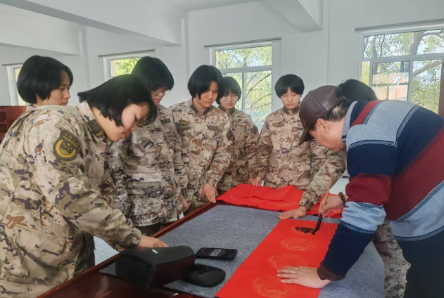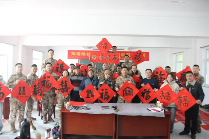 岁月如梭,转眼又至春回大地之时。一大早,按照既定的春联书写日程,六位书画老师跨越省城各地,踏着清晨的露水,随井岗社居委领导一行,来到了省武警总队某部。大家为坚守岗位的子弟兵们带来了一场精神文化的盛宴,将中国传统文化中的春联艺术带入了营房,激发了士兵们的满腔热血和昂扬斗志,士气大增。