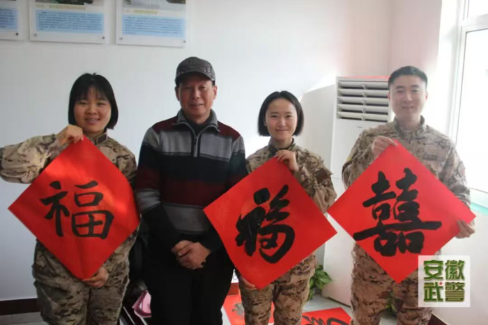三个多小时的书写时间,一晃而过,《安徽武警》将这一书写春联的活动,很快在次日的官网醒目发布。点开《快过年了,来看看我们写的春联吧!》这篇文章标题,打开阅读内容,见到自己与年轻的兵哥兵妹同框的照片,让我这个退伍多年的老兵,依然能走近军营,为官兵而歌,为军营而书,为新时代闪耀的军魂而赞,更让我重新找回了军旅的荣光……