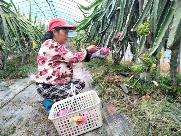 “除草、施肥、授粉、修剪、采摘、分拣、装运……基地活也不少,一个月能挣3000多元。”正在采摘火龙果的村民张翠霞说。目前,在基地长期务工的有4人,收获季节,每天有10多人在基地务工。