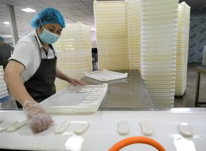 此时,一位高挑身材的青年男子正在厂房里,看到年糕制作有序进行,对今年的收益充满了期待。他就是该公司负责人,来自宿州市泗县农村的杨欢。“我们公司生产年糕口感好,在市场有竞争力,今年的收益也不会差。”杨欢虽然在工业园这里创业时间有4年之多,但生产年糕规模迅速扩大,每年年糕生产分旺季和淡季,旺季时每个月可生产400多吨的水磨年糕、脆皮年糕、拇指年糕条、爆酱年糕等,淡季每月可生产100多吨,年糕年销售量破千万元。